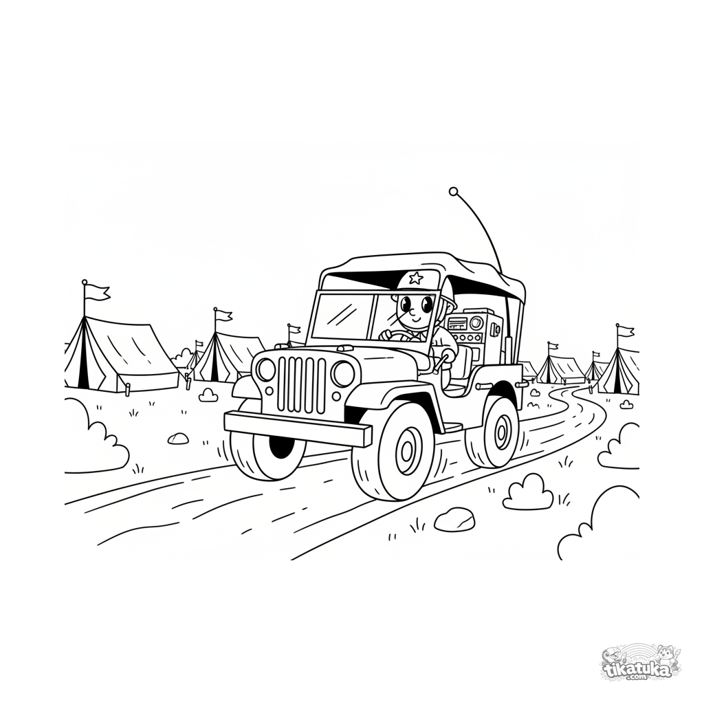 Página para colorear para 7-9 años: un jeep retro con radio conduce lentamente entre las carpas del cuartel general. Estilo de dibujos animados antiguos.