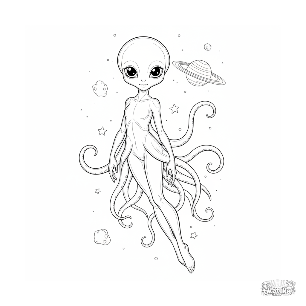 Página para colorear para niños de 7-9 años: una criatura grácil similar a una medusa flota entre estrellas frente a un planeta anillado.