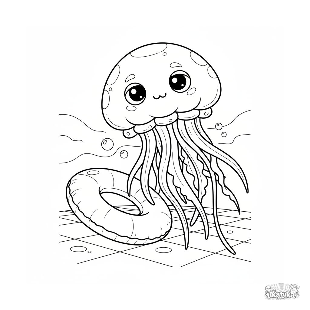 Página para colorear para niños de 7-9 años: una medusa flota cerca de un flotador. Detalle moderado, formas fluidas expresivas.