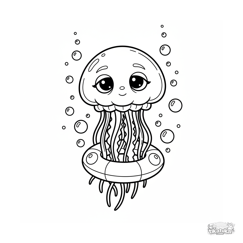 Página para colorear para niños 7-9: una suave medusa flota en el agua sobre un aro inflable en el fondo de la piscina, rodeada de un jardín de burbujas. Detalle moderado.