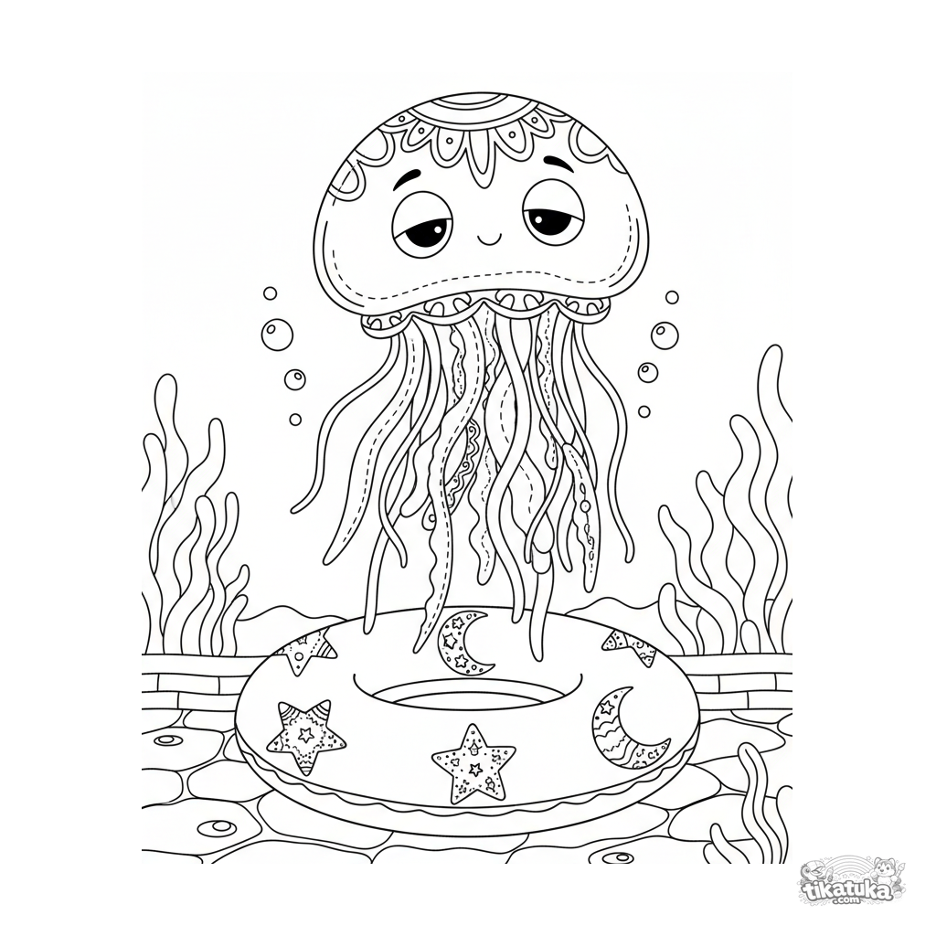 Página para colorear detallada para niños mayores de 10-12 años: una medusa elegante flota sobre un aro inflable con estampas en el fondo de la piscina.