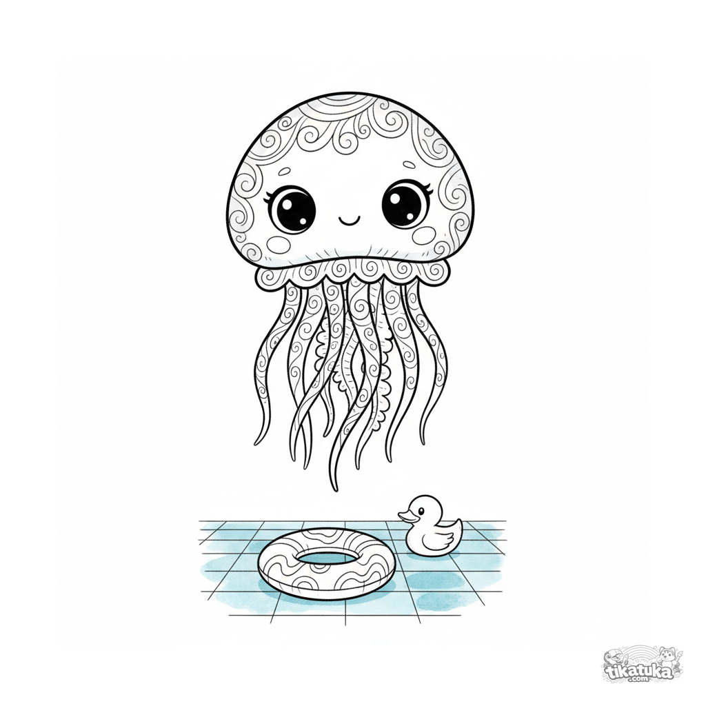 Página para colorear compleja para niños mayores 10-12: una medusa flota sobre un aro inflable y un juguete en el fondo. Tentáculos largos, texturas, atmósfera de agua tranquila.