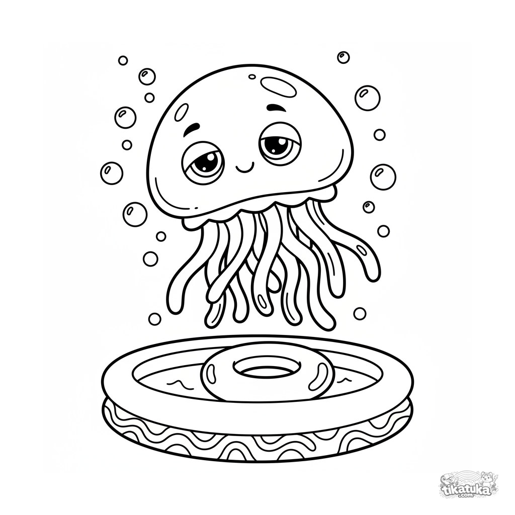 Página para colorear muy simple para niños de 2-3 años: una medusa redonda con tentáculos flota sobre el fondo de una piscina, con burbujas alrededor. Formas grandes cerradas, detalles mínimos.