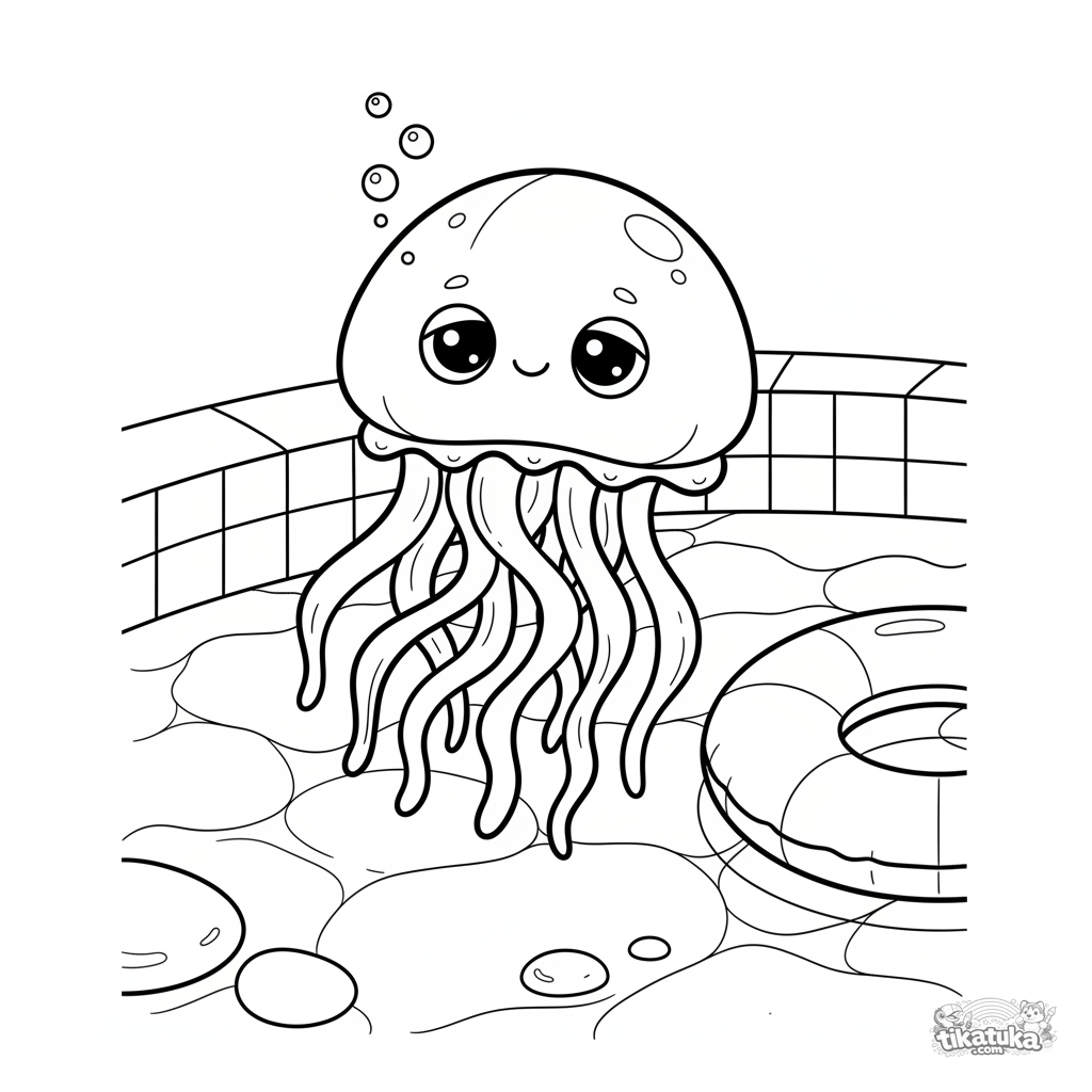 Página para colorear para 7-9 años: una suave medusa flota sobre el fondo de la piscina, con la sombra de un flotador cerca. Líneas fluidas, escena tranquila.