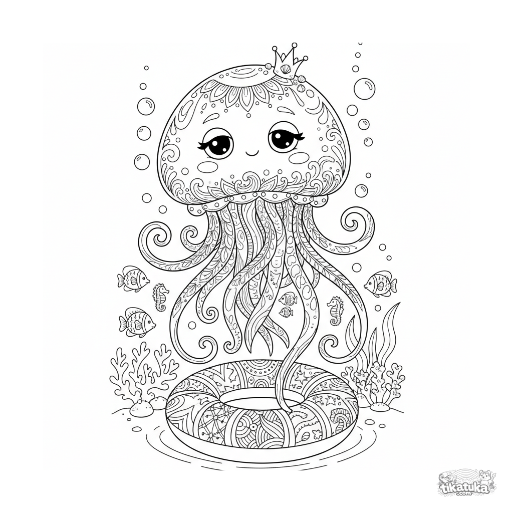 Página para colorear detallada para niños mayores 10-12: una medusa grácil con tentáculos largos baila alrededor de un flotador en el fondo de la piscina. Líneas intrincadas, formas fluidas.