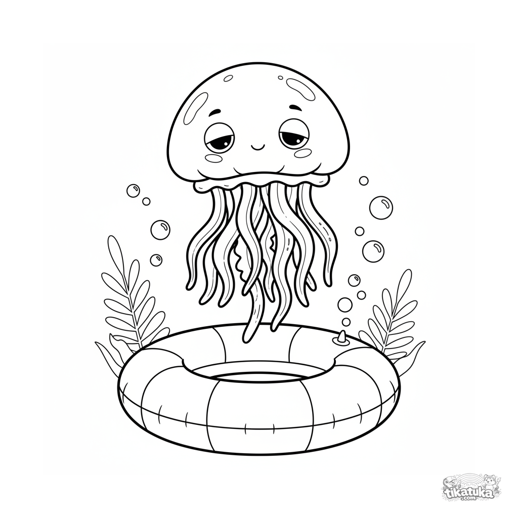 Página para colorear para niños de 7 a 9 años: una medusa suave flota sobre un anillo inflable en el fondo de la piscina.