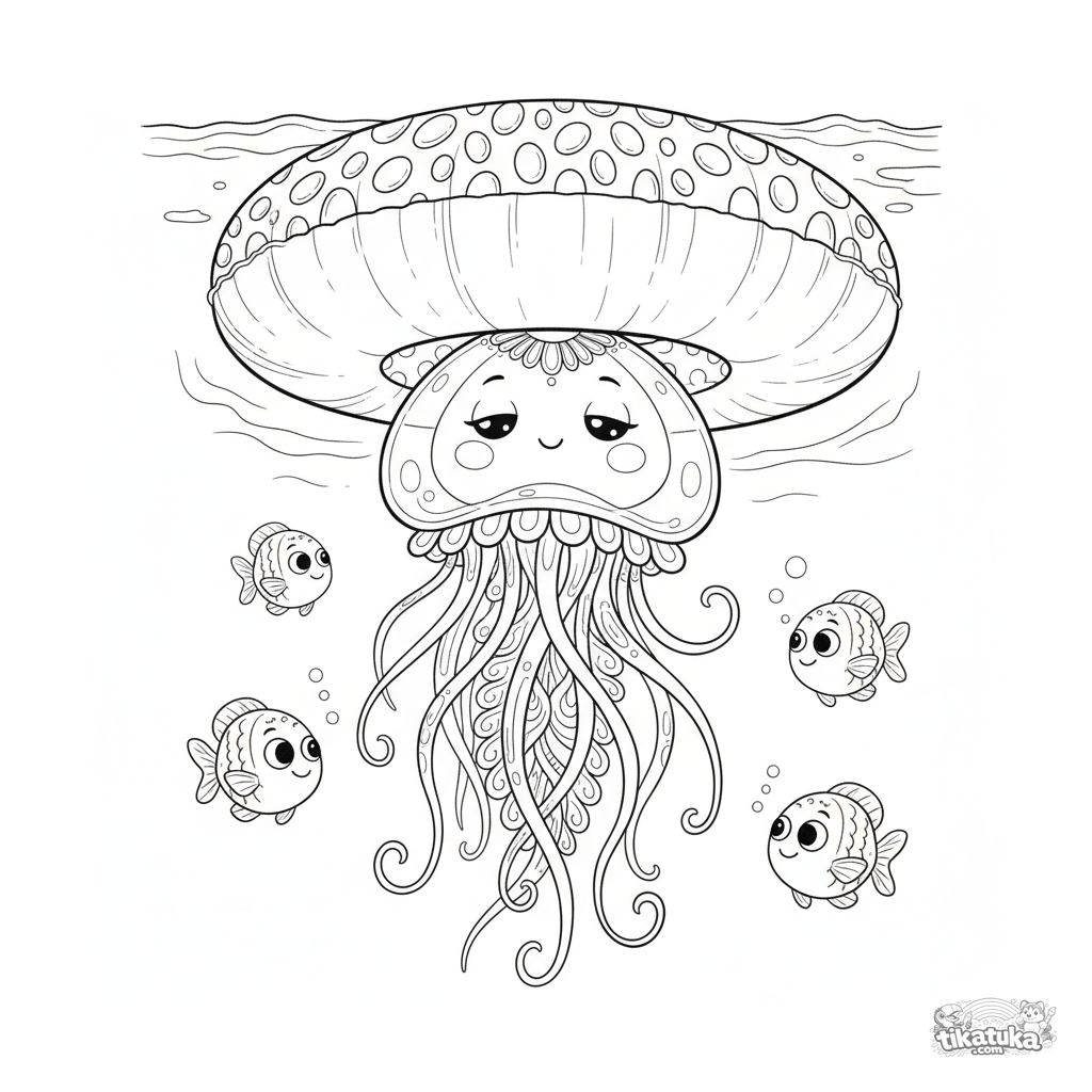 Página para colorear detallada para niños mayores 10-12: una medusa grácil con tentáculos largos inspecciona la parte inferior de un flotador en el fondo de la piscina. Texturas, transparencia y expresión curiosa.
