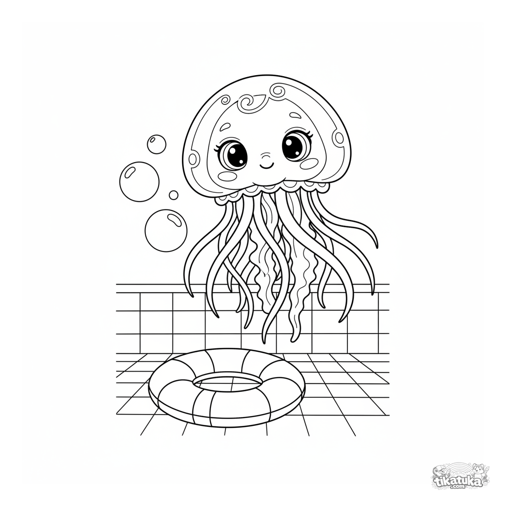 Página para colorear de una medusa brillante flotando en el fondo de una piscina cerca de un anillo. Para niños de 7 a 9 años.