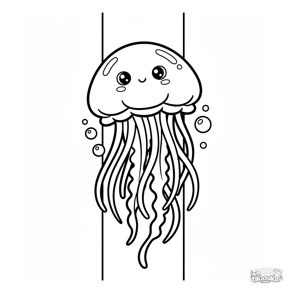 Página para colorear muy simple para niños pequeños 2-3: una linda medusa flota en un rayo de sol en aguas poco profundas. Formas grandes y claras.