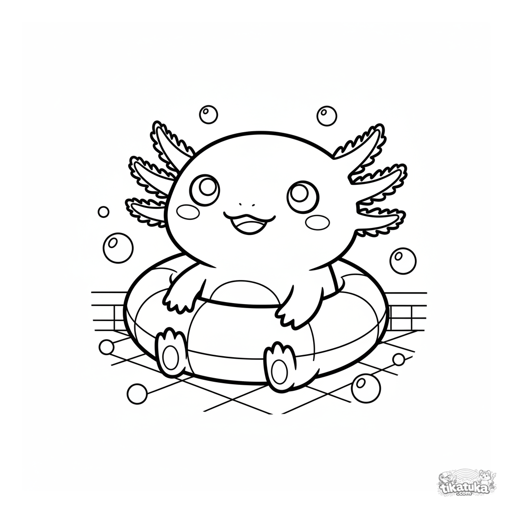 Página para colorear de un lindo ajolote en el fondo de una piscina con un anillo inflable. Para niños de 4 a 6 años.