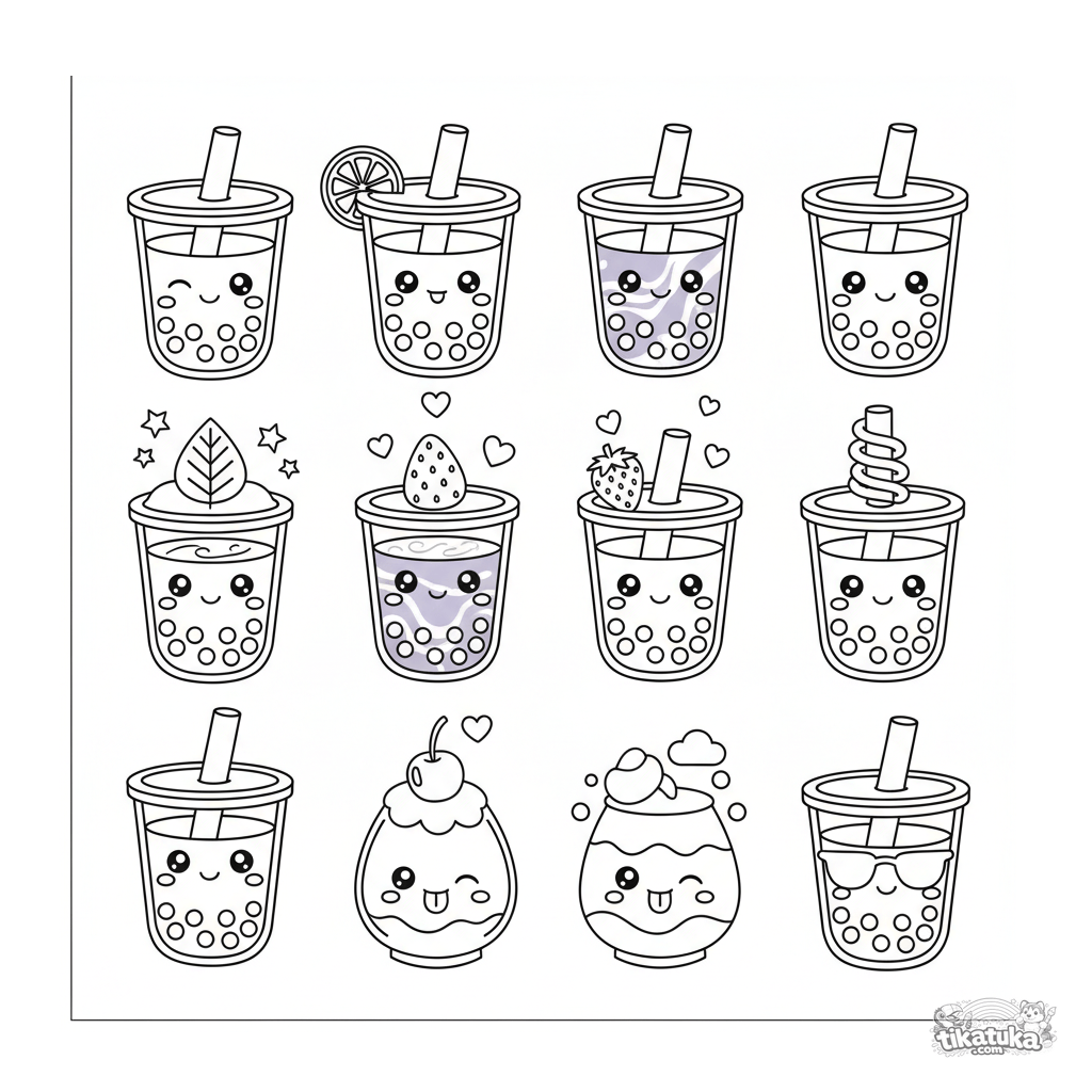 Página colección para colorear para niños 7-12 años: una hoja con 12 personajes de bebidas boba kawaii. Múltiples objetos separados para colorear y recortar.