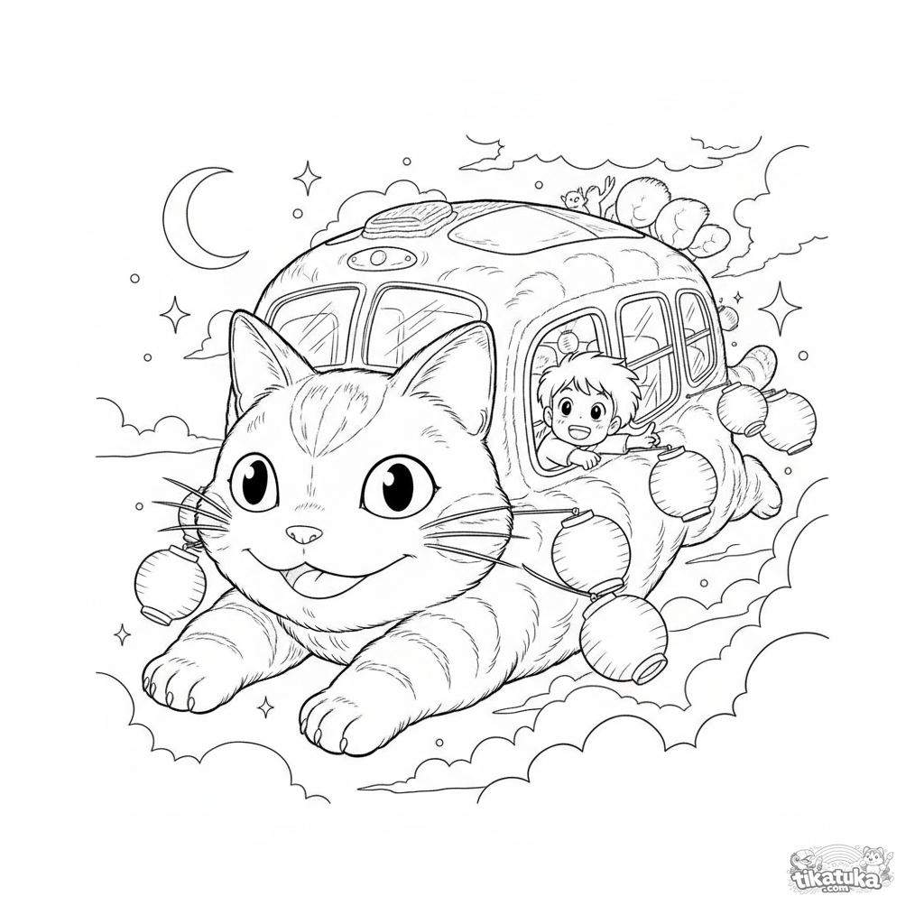 Página para colorear mágica estilo anime: un espíritu gato autobús galopa por el cielo nocturno con un niño en su ventana. Nubes, estrellas y patrones de pelaje detallados. Para niños de 10-12 años.