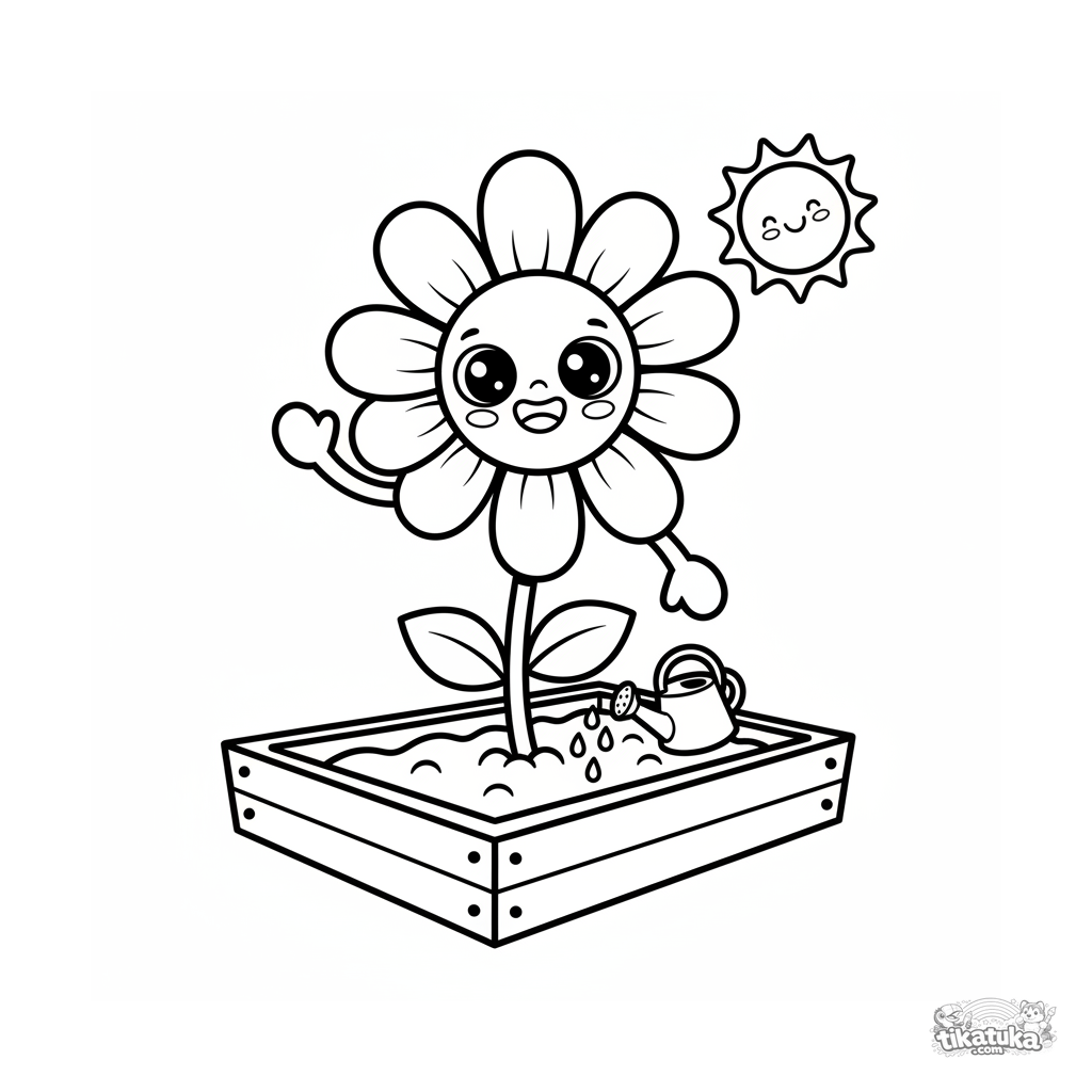 Página simple para colorear de una margarita kawaii con cara para bebés de 2 a 3 años. Formas grandes y claras, flor en un jardín.