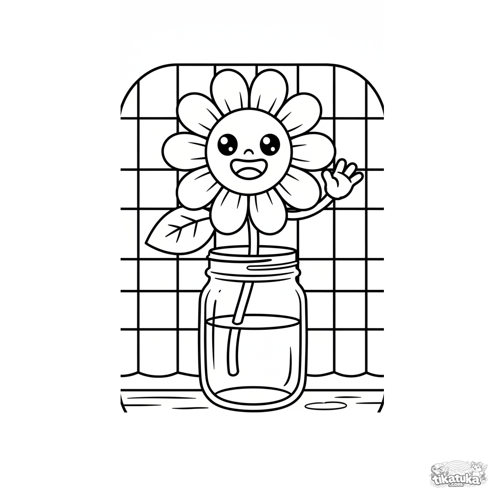Página simple para colorear para bebés 2-3: una margarita sonriente en un tarro en el alféizar. Formas grandes y claras.