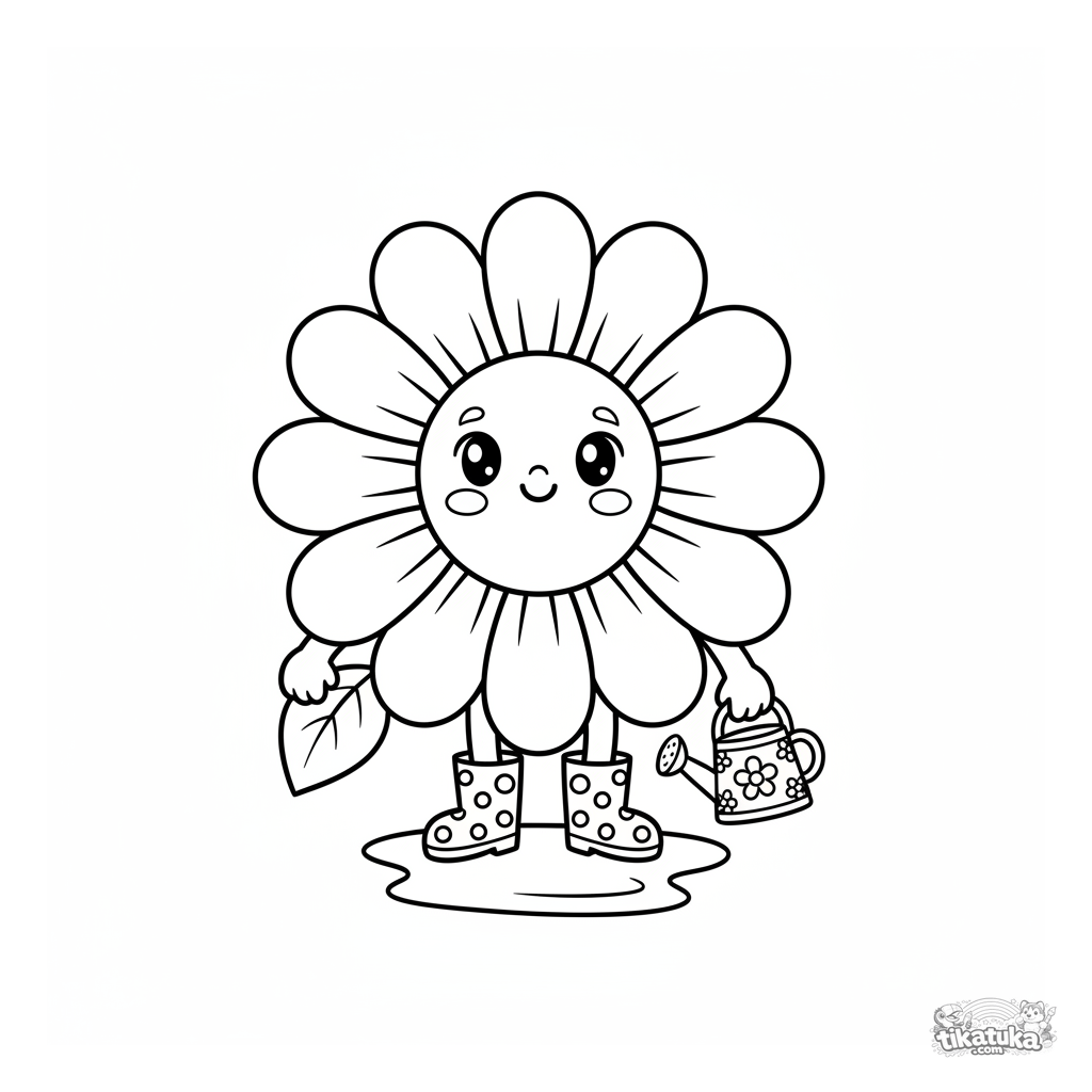 Página simple para colorear para bebés 2-3: una margarita sonriente en botas de lluvia con regadera. Formas grandes y claras.