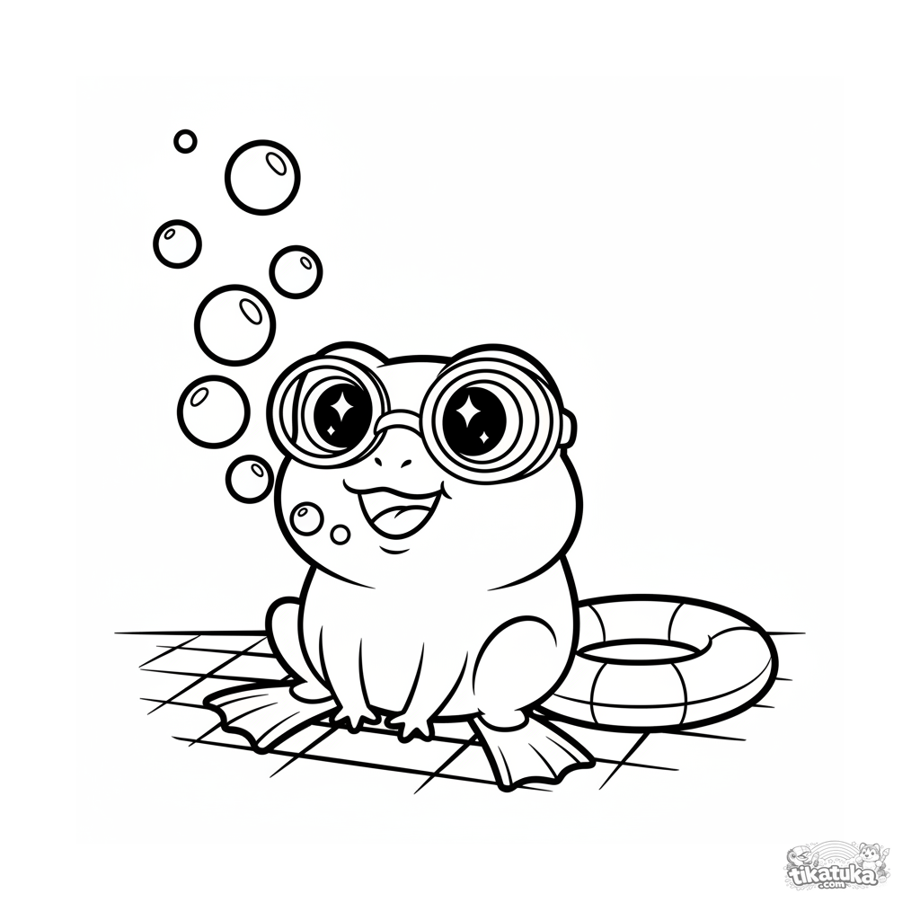 Página para colorear para niños pequeños de 2-3 años: una linda rana con gafas de natación sentada en el fondo de una piscina junto a un flotador. Formas grandes y simples.