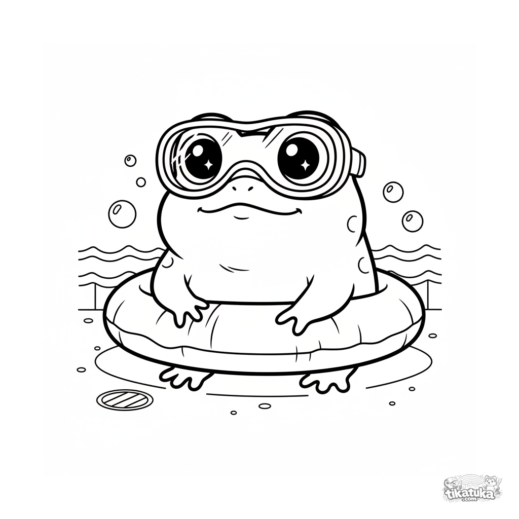 Página para colorear para 7-9 años: una linda rana kawaii con gafas de buceo asoma desde detrás de un flotador en el fondo de la piscina. Detalles expresivos, contornos limpios.