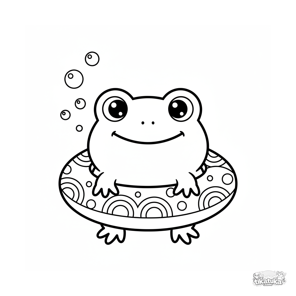 Página simple para colorear para niños pequeños de 2-3 años: una linda rana kawaii se asoma desde debajo de un flotador. Formas grandes, contornos claros.