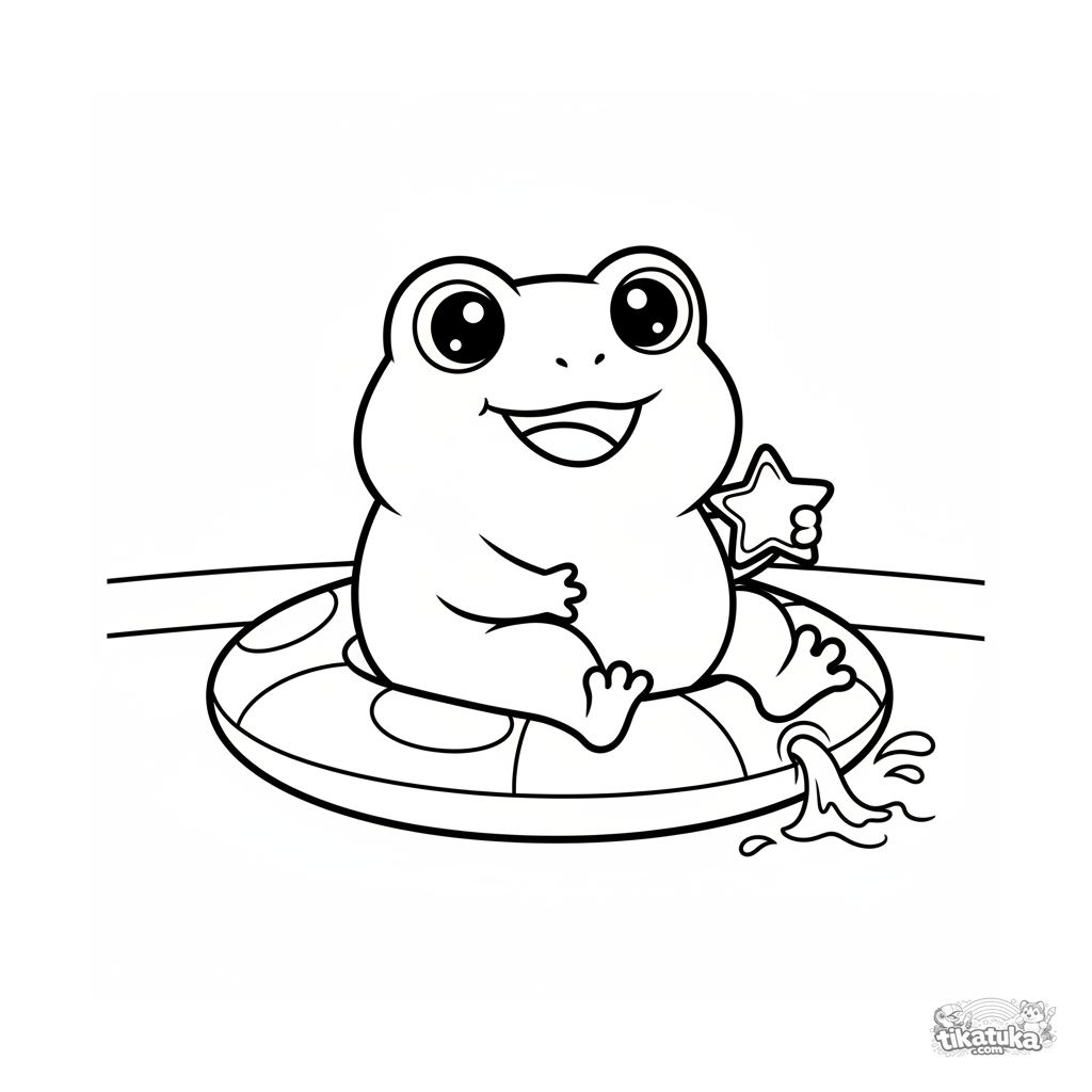 Página simple para colorear para niños pequeños 2-3: una linda rana kawaii sentada en un aro inflable de nenúfar en el fondo de la piscina. Formas grandes, pocos detalles.