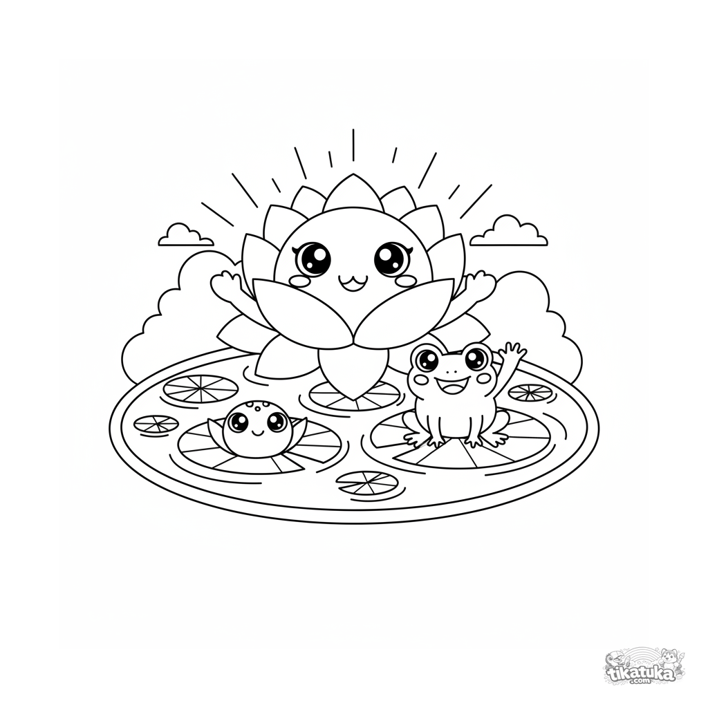 Página para colorear tierna para niños de 4-6 años: una flor de loto sonriente en un estanque con una rana. Formas simples y escena amigable.