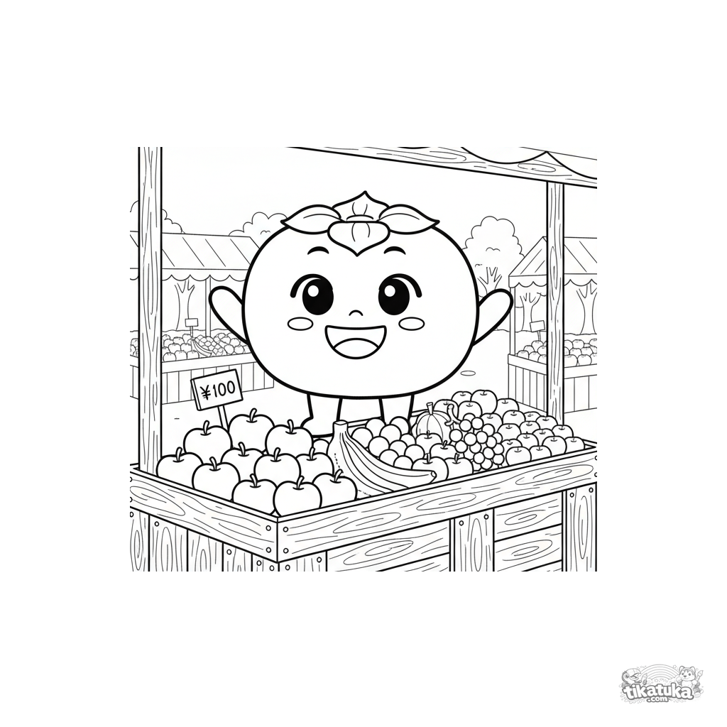 Página para colorear de un persimón kawaii saludando desde un puesto de mercado. Para niños de 4 a 6 años.