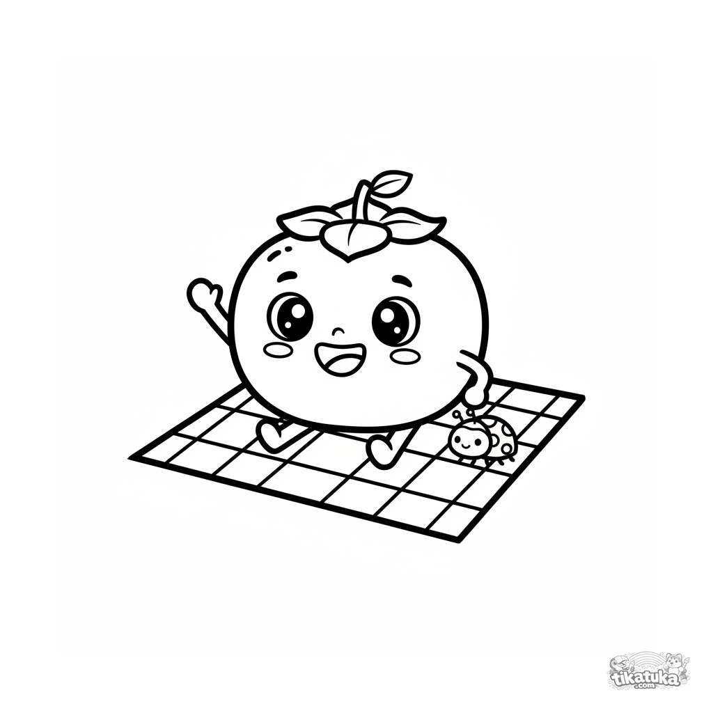 Página para colorear para niños pequeños: un persimonio kawaii con una sonrisa saluda desde una manta de picnic. Formas simples, amplios márgenes.