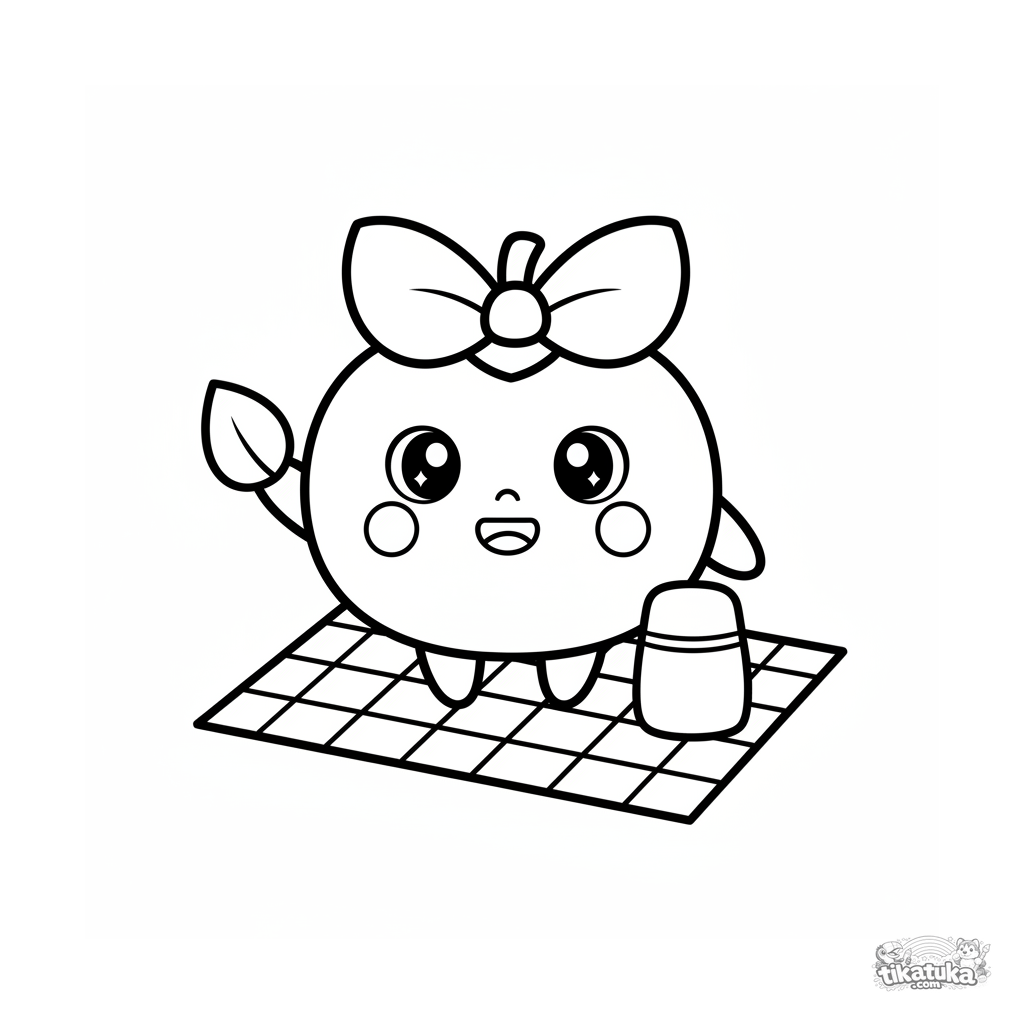 Página para colorear para niños pequeños: un caqui kawaii con un lazo está sobre una manta de picnic a cuadros. Formas simples, márgenes amplios.