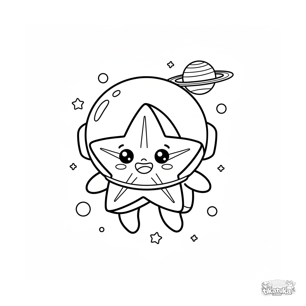 Página para colorear para 7-9 años: una rodaja de carambola feliz en traje espacial flota en el espacio. Estilo kawaii, fondo estrellado.