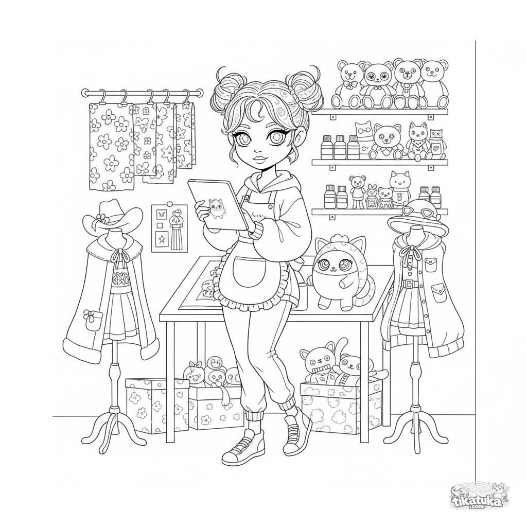Página para colorear para 10-12 años: una diseñadora de moda kawaii trabajando en un estudio del sótano. Detalles: tableta, maniquíes, muestras de tela, peluches y botes de pintura.