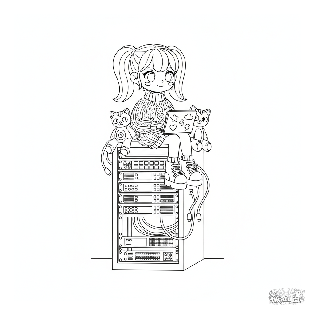 Página para colorear estilo anime: un hacker con moda kawaii sentado en un rack de servidores con un portátil. Escena vibrante con detalles lindos.