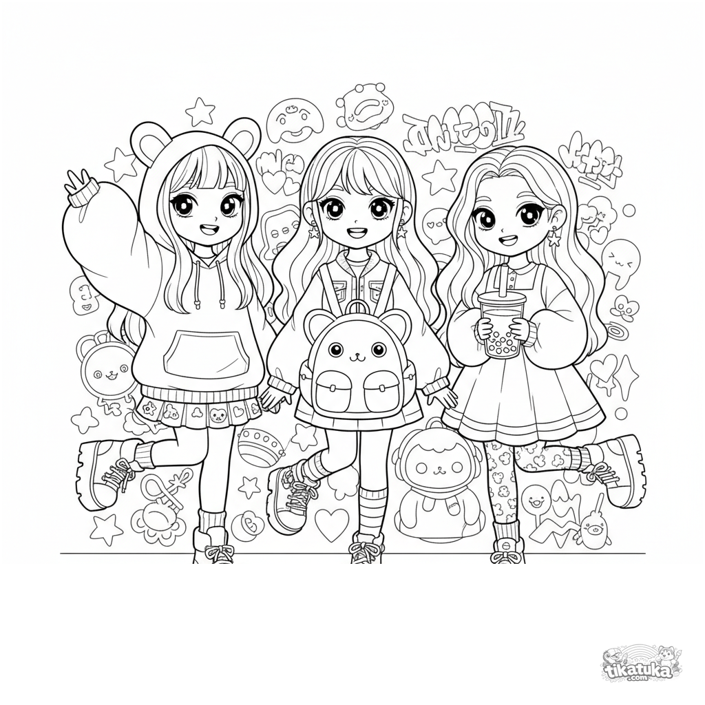 Página para colorear para niños de 7 a 12 años: un trío de moda callejera kawaii posando frente a un muro de graffiti vibrante. Escena compleja con ropa y accesorios detallados.