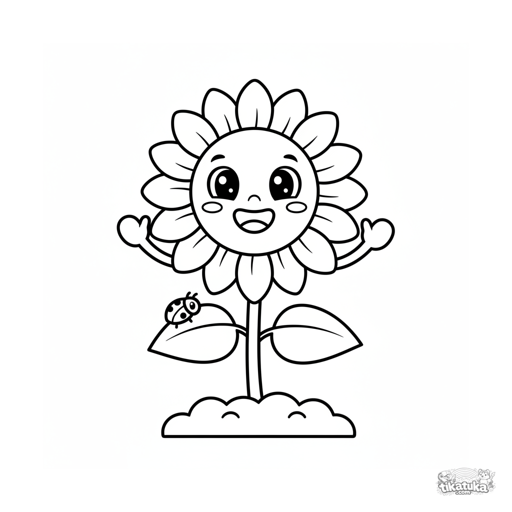 Página para colorear para niños pequeños: un girasol kawaii sonriente saluda con sus hojas-brazos en el jardín. Formas simples, amplios márgenes.