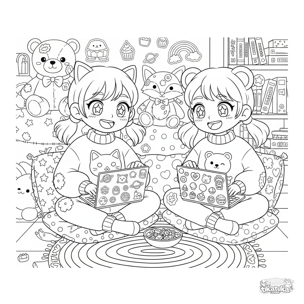 Página para colorear para niños de 10-12 años: dos amigos en un rincón acogedor del sótano decorando sus portátiles con pegatinas y keycaps estilo kawaii. Muchos detalles y accesorios lindos.