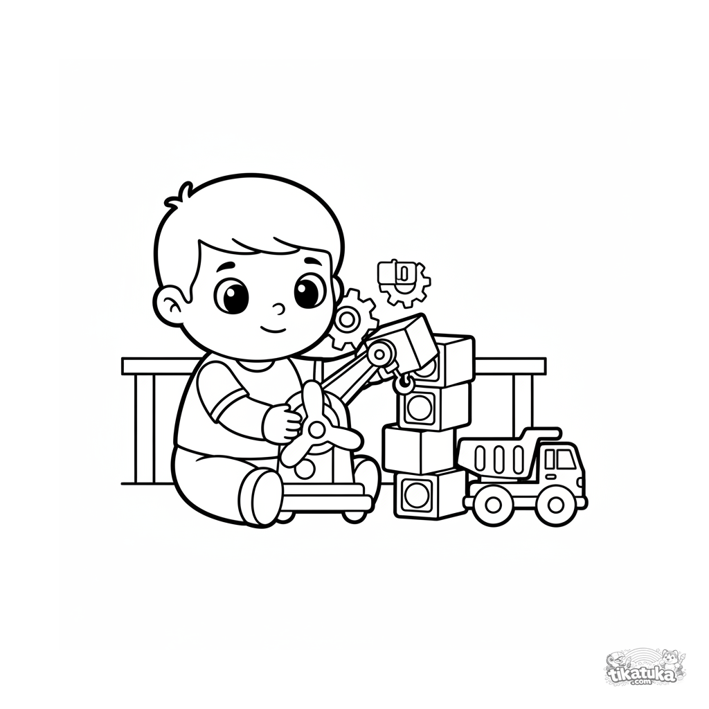 Página para colorear simple para niños pequeños 2-3: un niño en un laboratorio juega con una grúa de juguete de cuerda, construyendo una torre.