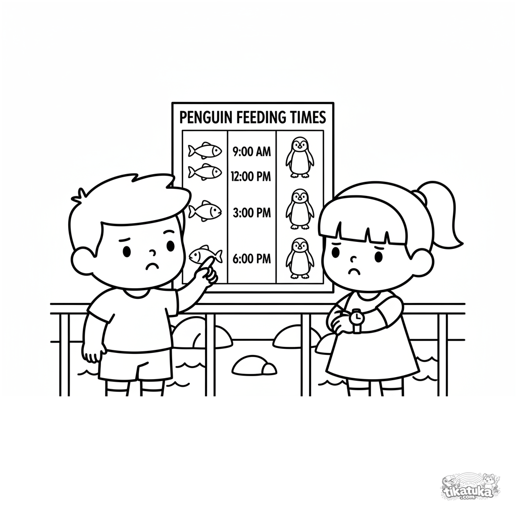 Página para colorear para niños 7-9 años. Dos niños comparan un gran gráfico de horarios de alimentación de pingüinos con iconos de peces, mirando un reloj.