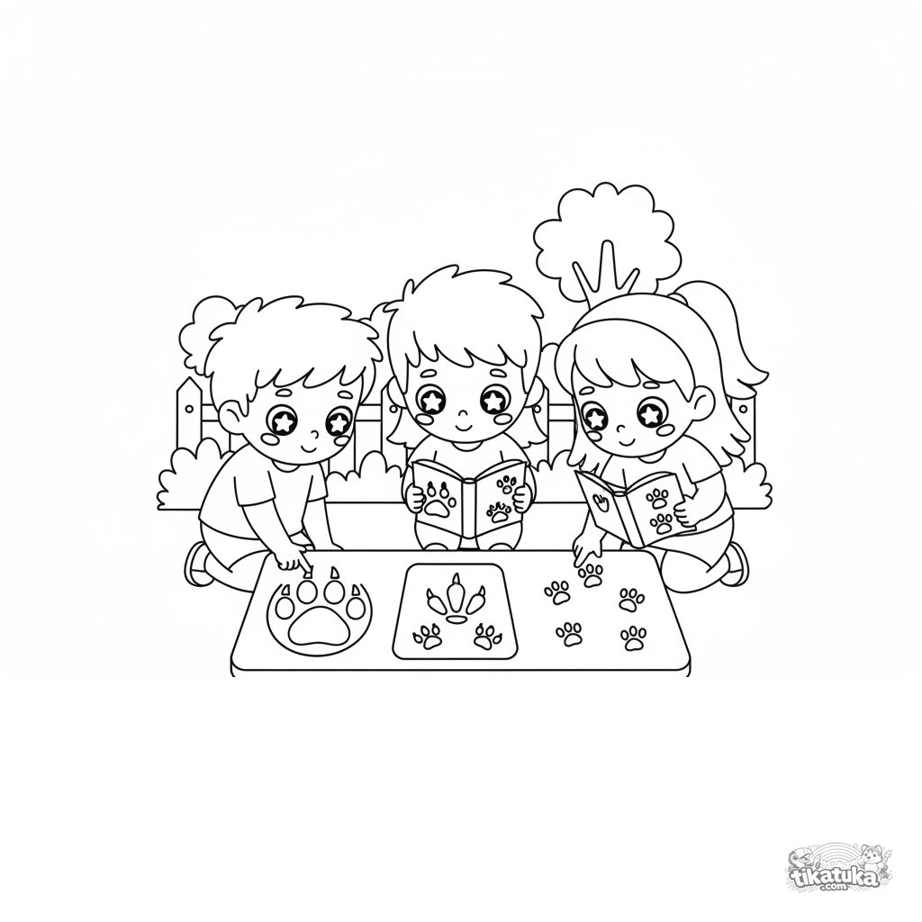 Página para colorear para niños 4-6: niños estudiando y comparando diferentes huellas de animales en un cartel especial del zoológico. Estilo vectorial plano y brillante.