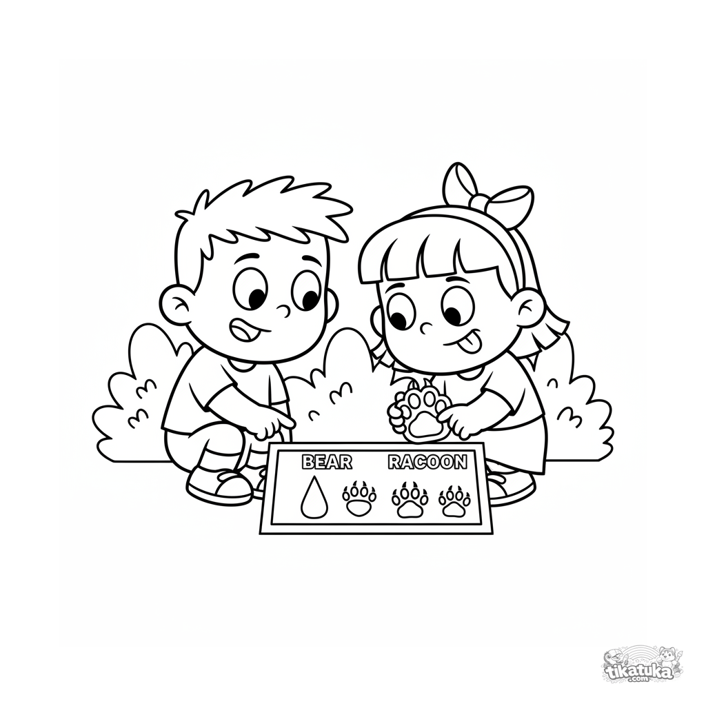 Página para colorear para 7-9 años: dos niños estudian con entusiasmo huellas de oso y mapache en un cartel interactivo del zoológico.