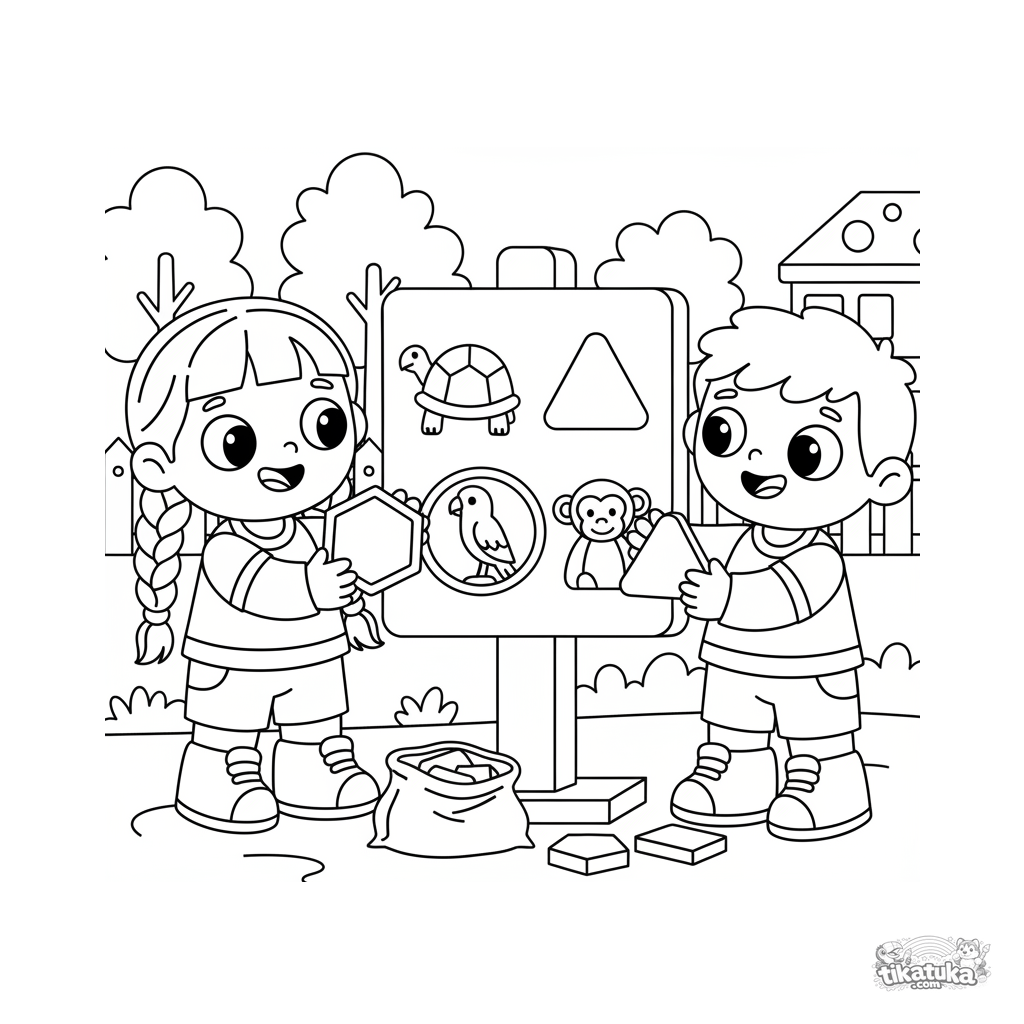 Página para colorear para niños de 7-9 años. Los niños juegan con un cartel interactivo del zoológico, emparejando formas geométricas con siluetas de animales. Escena para aprender sobre formas.