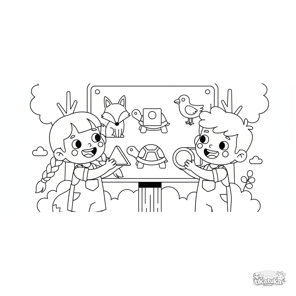 Página para colorear para niños 7-9: niños en un panel interactivo del zoológico emparejan formas geométricas con siluetas de animales. Aprender formas jugando.
