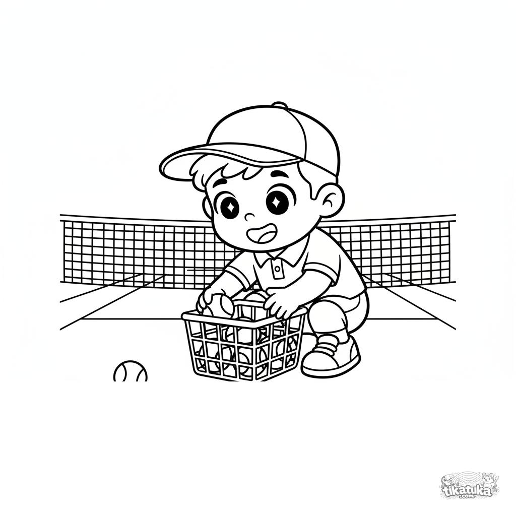 Página para colorear para niños de 4-6 años: un joven ayudante en una pista de tenis recogiendo pelotas. Escena divertida y comprensible sobre un rol deportivo.