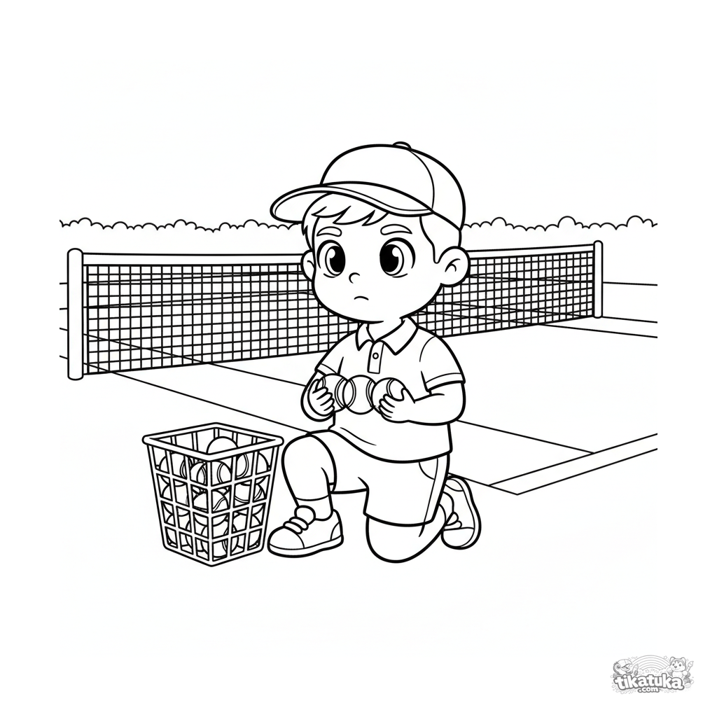Página para colorear para niños de 4-6 años: un joven ayudante en la cancha de tenis — un recogepelotas listo para suministrar pelotas. Escena con cesta, pelotas y red.