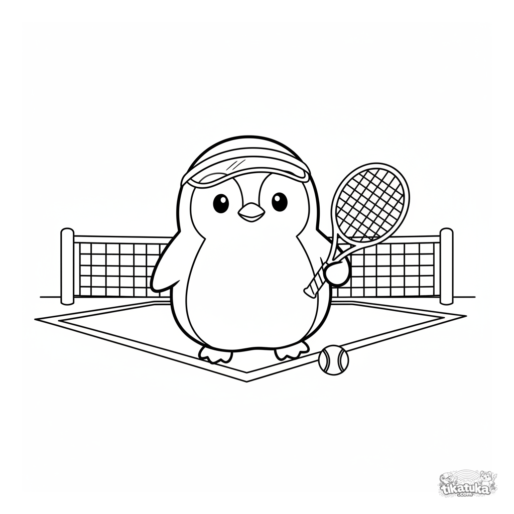 Página para colorear para niños de 4-6 años: un pingüino gracioso con raqueta camina por una pista de tenis. Estilización chibi tierna, formas simples y claras.