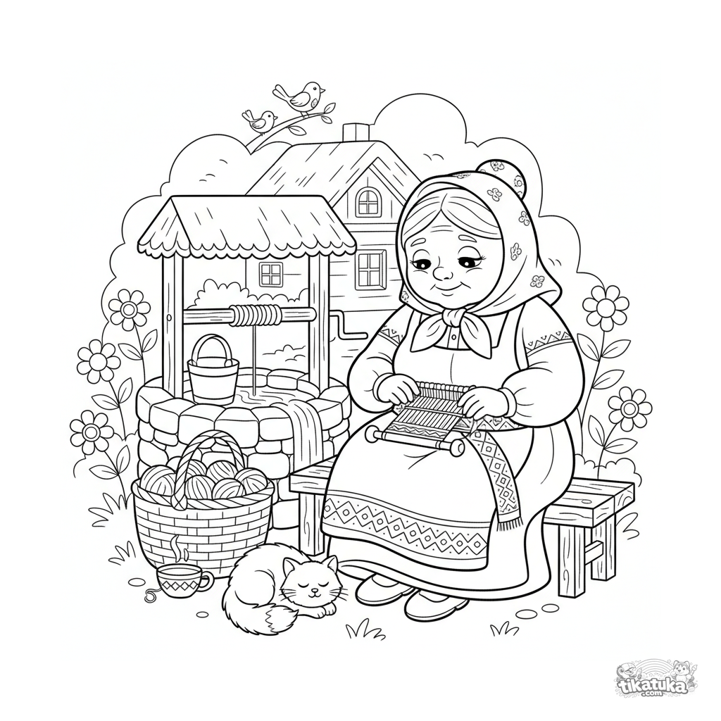 Página para colorear para niños 4-6: una abuela bondadosa tejiendo un cinturón junto al pozo de agua viva. Detalles con patrones en estilo bordado folclórico, escena acogedora.
