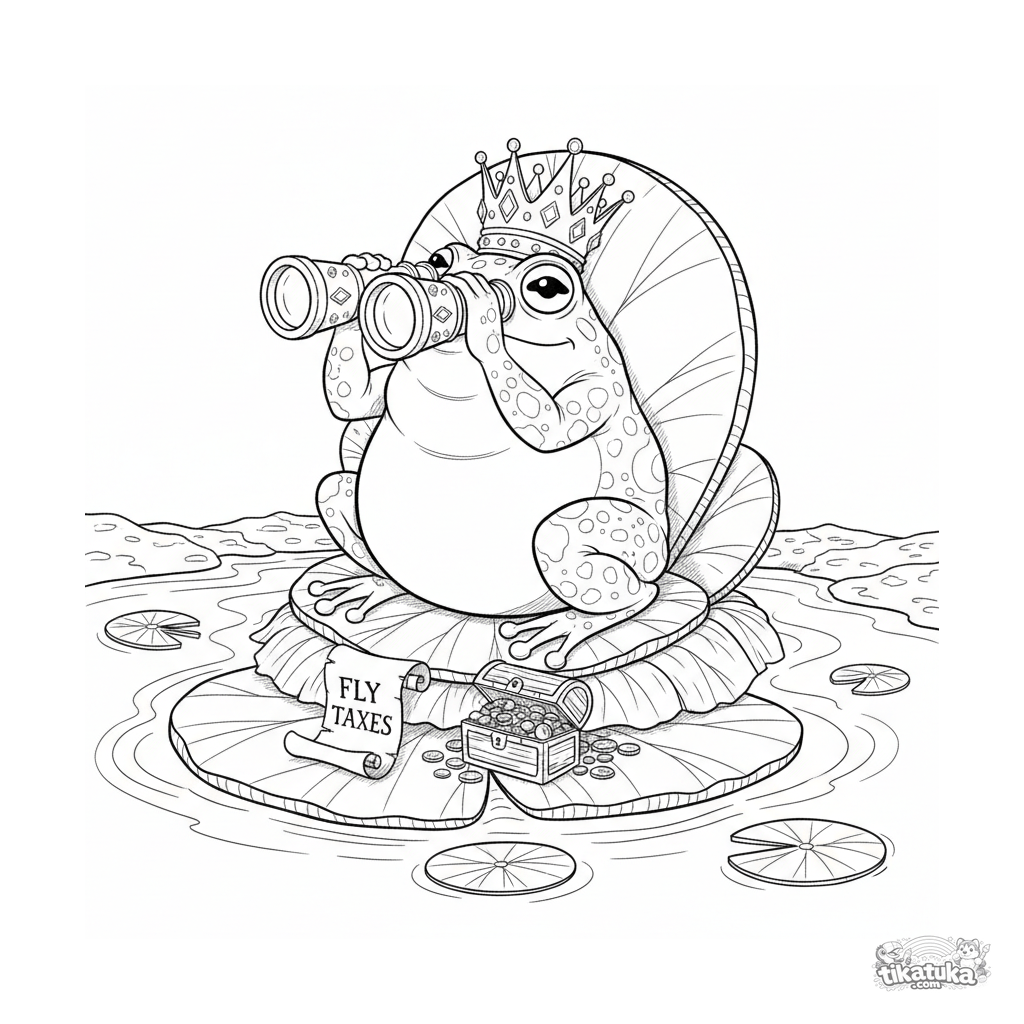 Página para colorear para niños 10-12: un Rey Rana en un trono de nenúfar usa prismáticos enjoyados para inspeccionar la orilla del estanque. Escena humorística detallada.