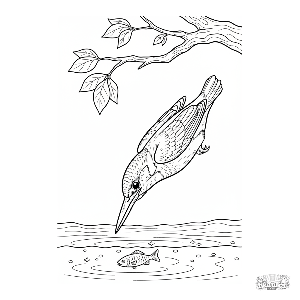 Página para colorear para 7-9 años: un martín pescador en un rápido descenso se zambulle hacia la superficie de un arroyo tras un pez. Escena de acción.