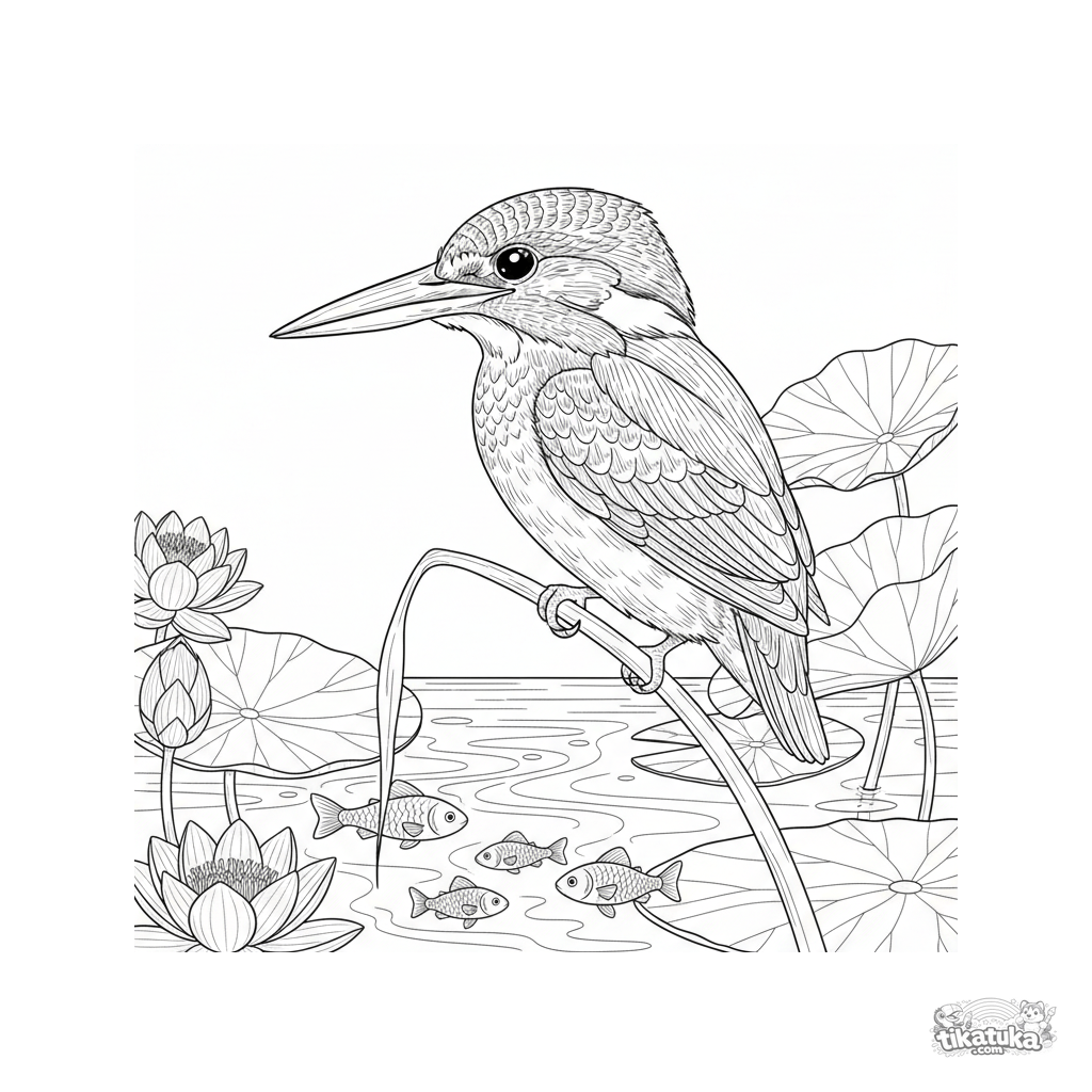 Página detallada para colorear para niños 10-12: un martín pescador en un junco sobre un arroyo, esperando presa. Contornos realistas, plumas, plantas acuáticas.