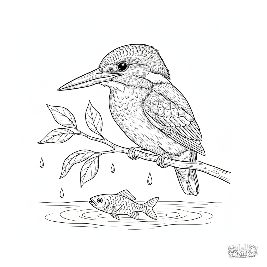 Página para colorear detallada en estilo grabado vintage para 10-12 años: un martín pescador vibrante está posado en una rama sobre un arroyo, listo para zambullirse por un pez.
