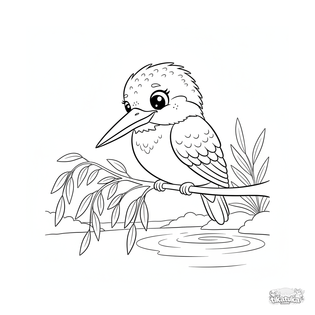 Página para colorear para niños de 4 a 6 años: un martín pescador vibrante se posa en una rama delgada sobre un arroyo claro, observando atentamente.