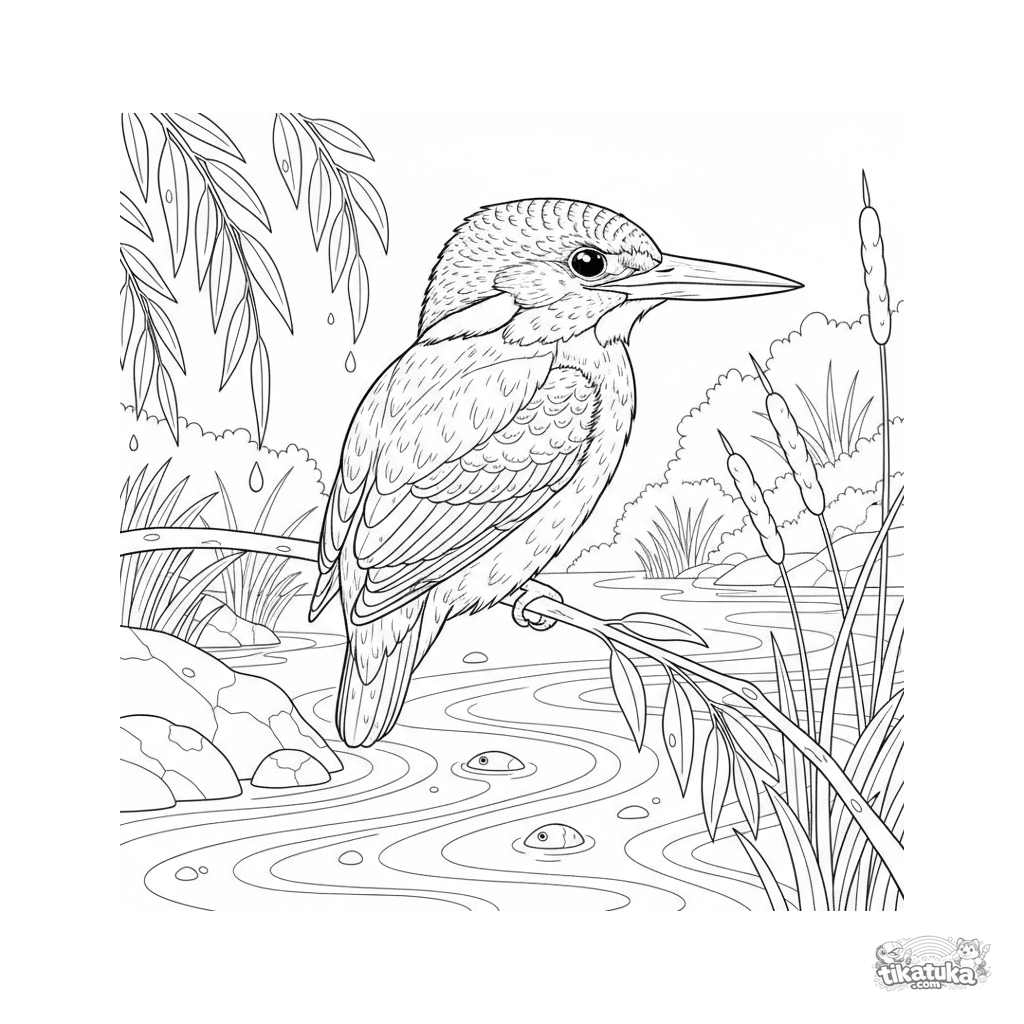 Página para colorear para mayores 10-12: un martín pescador detallado posado en una rama sobre un arroyo claro. Ilustración realista de un pájaro.