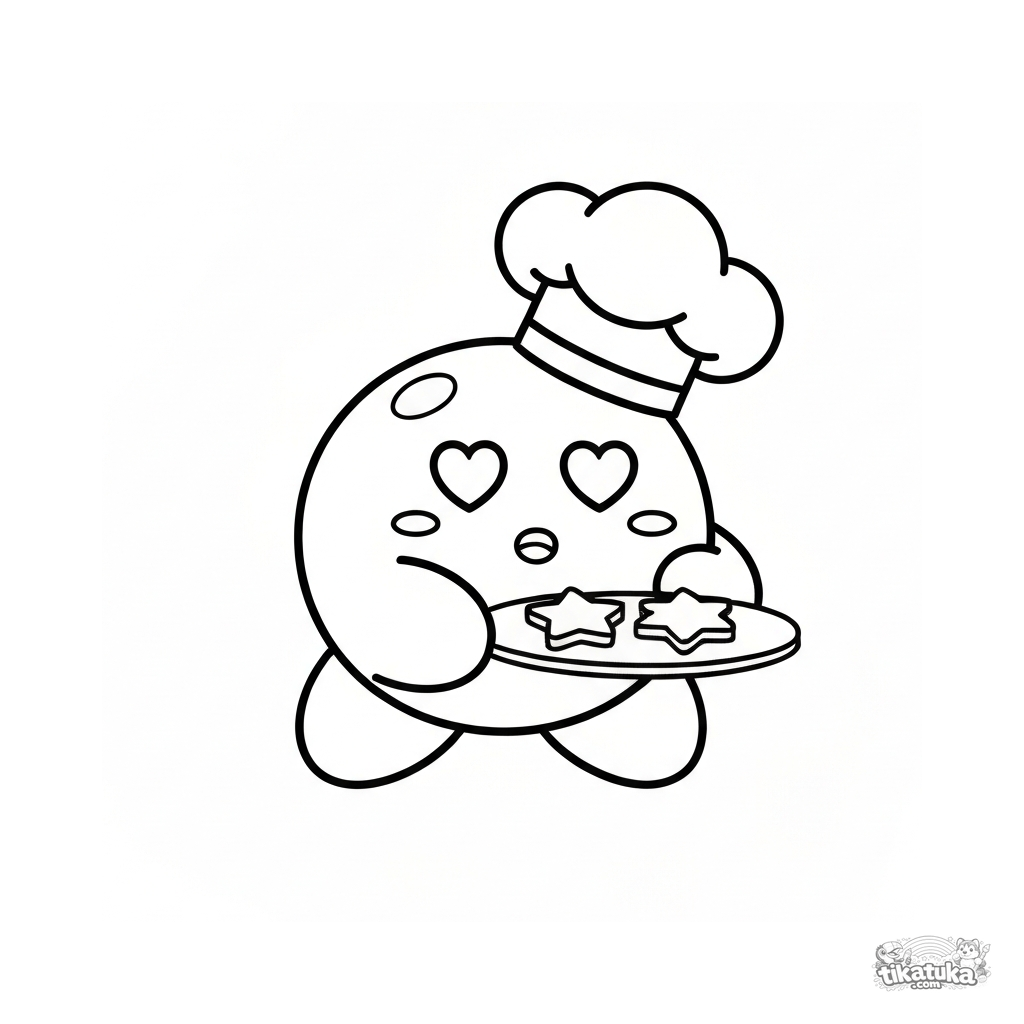 Página para colorear para niños. Lindo microbio redondo con gorro de chef horneando galletas en forma de estrella. Líneas simples. Descarga gratis.